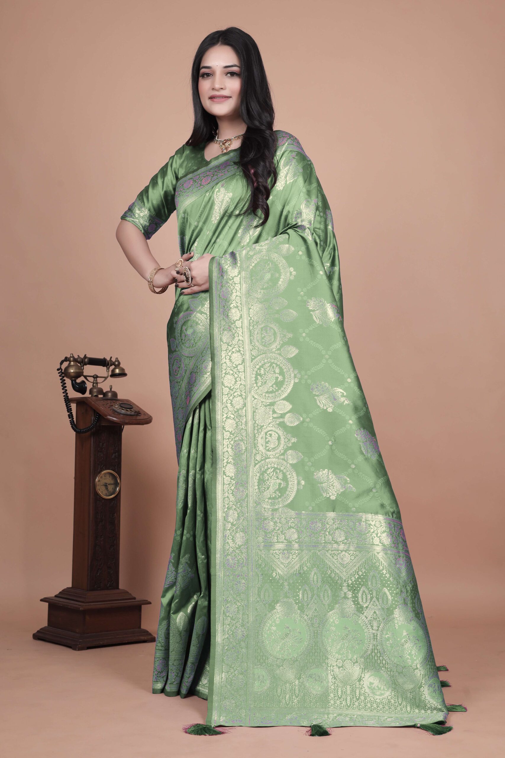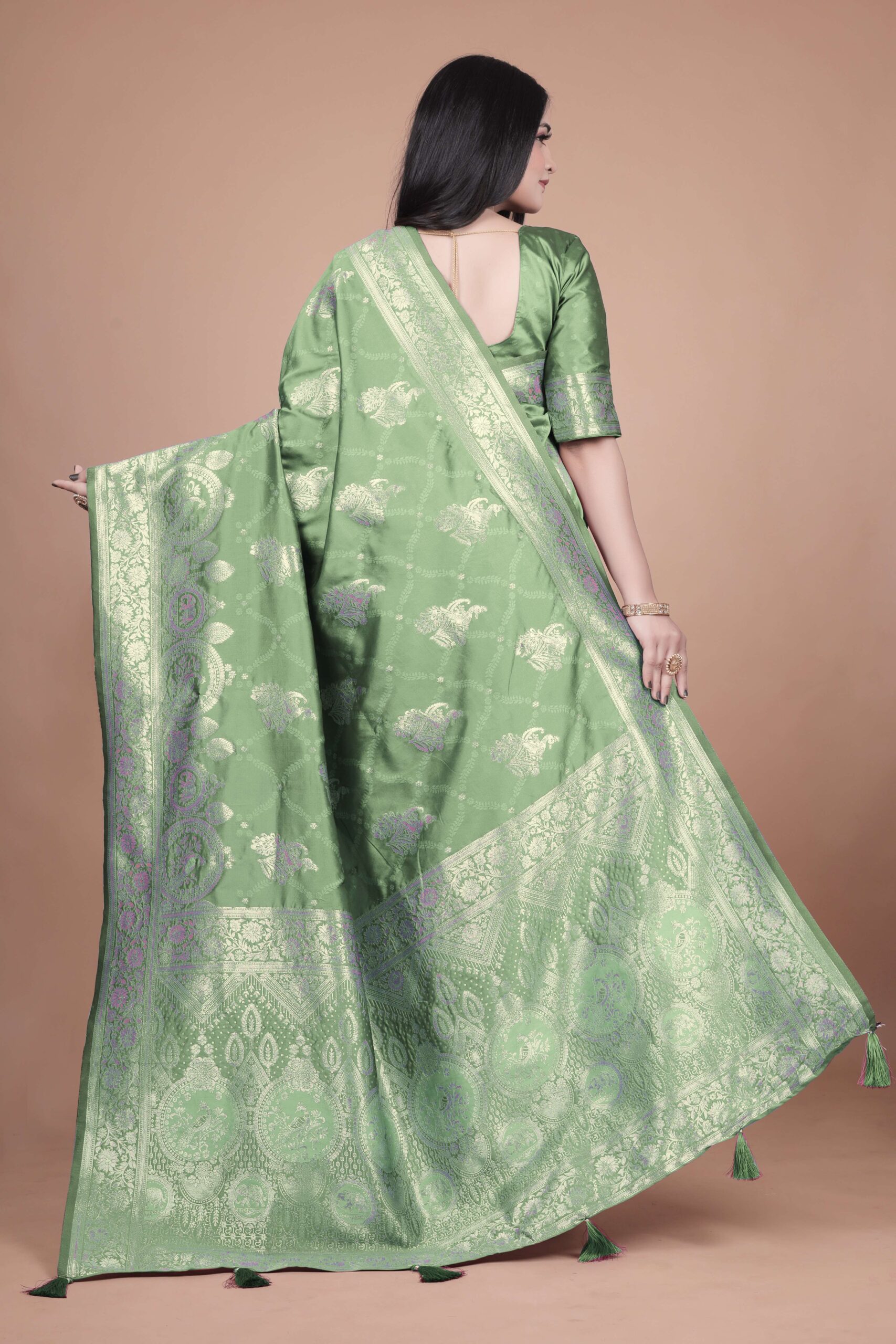 Step into regal elegance with this Mint Green Banarasi Silk Saree with Golden Zari Weaving. Crafted from premium Banarasi silk, the saree is adorned with intricate golden zari motifs, including traditional floral and vine patterns that reflect the grandeur of Indian heritage craftsmanship.