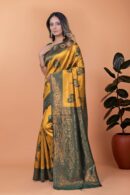 Make a statement with this Mustard Yellow & Green Zari Woven Banarasi Silk Saree, a harmonious blend of tradition and elegance. The vibrant mustard silk body is adorned with intricate floral and paisley zari motifs, creating a regal and festive look.