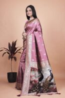 Indulge in the grandeur of tradition with this Rosewood Pink Banarasi Silk Saree with Artistic Peacock Pallu, a true masterpiece of Indian craftsmanship. Made from premium Banarasi silk, the saree boasts a rich, lustrous texture that drapes effortlessly, radiating sophistication at every occasion.